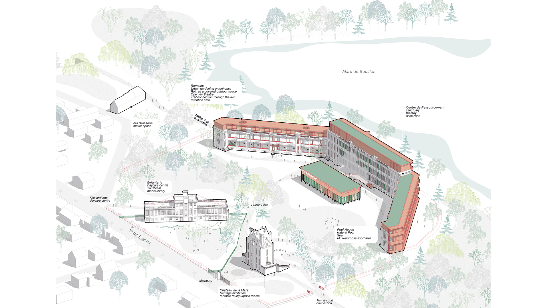 Das Projekt transformiert das ehemalige Gelände der „Colonie Scolaire de St. Ouen“ in ein ganzjährig aktives Centre de Ressourcement, das dem saisonalen Leerstand in Küstenorten wie Jullouville entgegenwirkt. Ziel ist es, durch neue Nutzungen dauerhafte Bewohner anzuziehen und soziale, gesundheitliche und wirtschaftliche Impulse zu setzen.