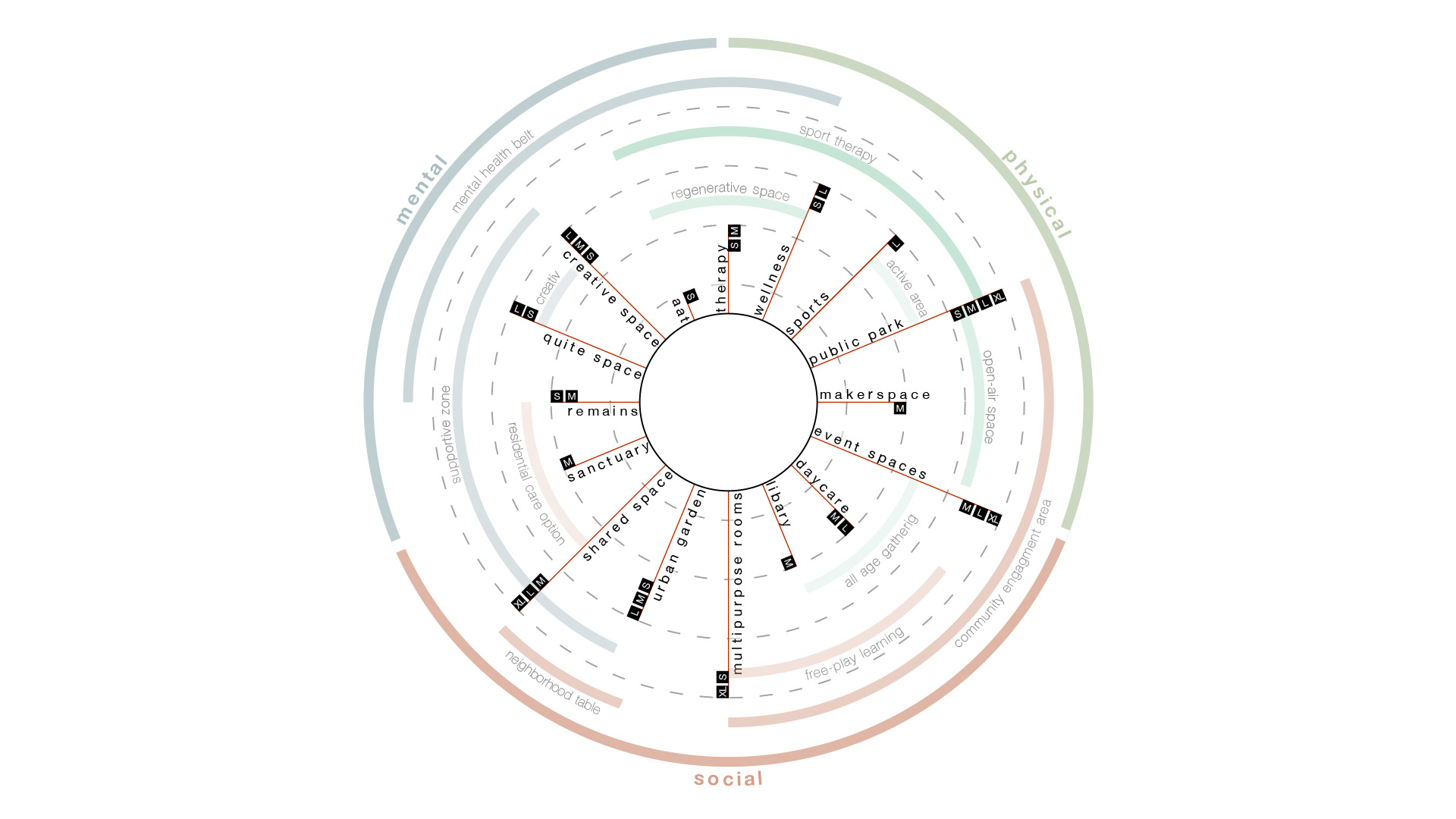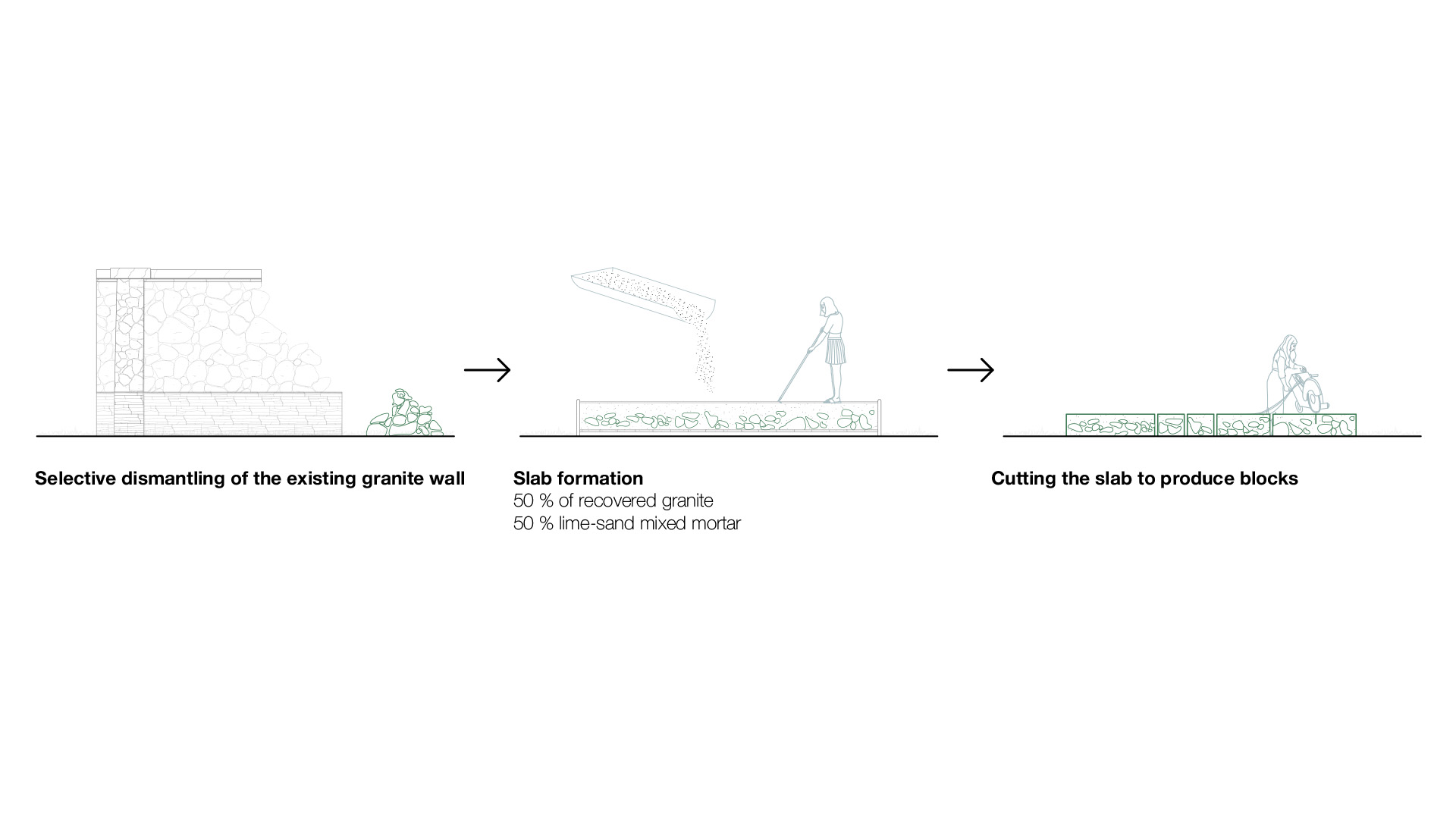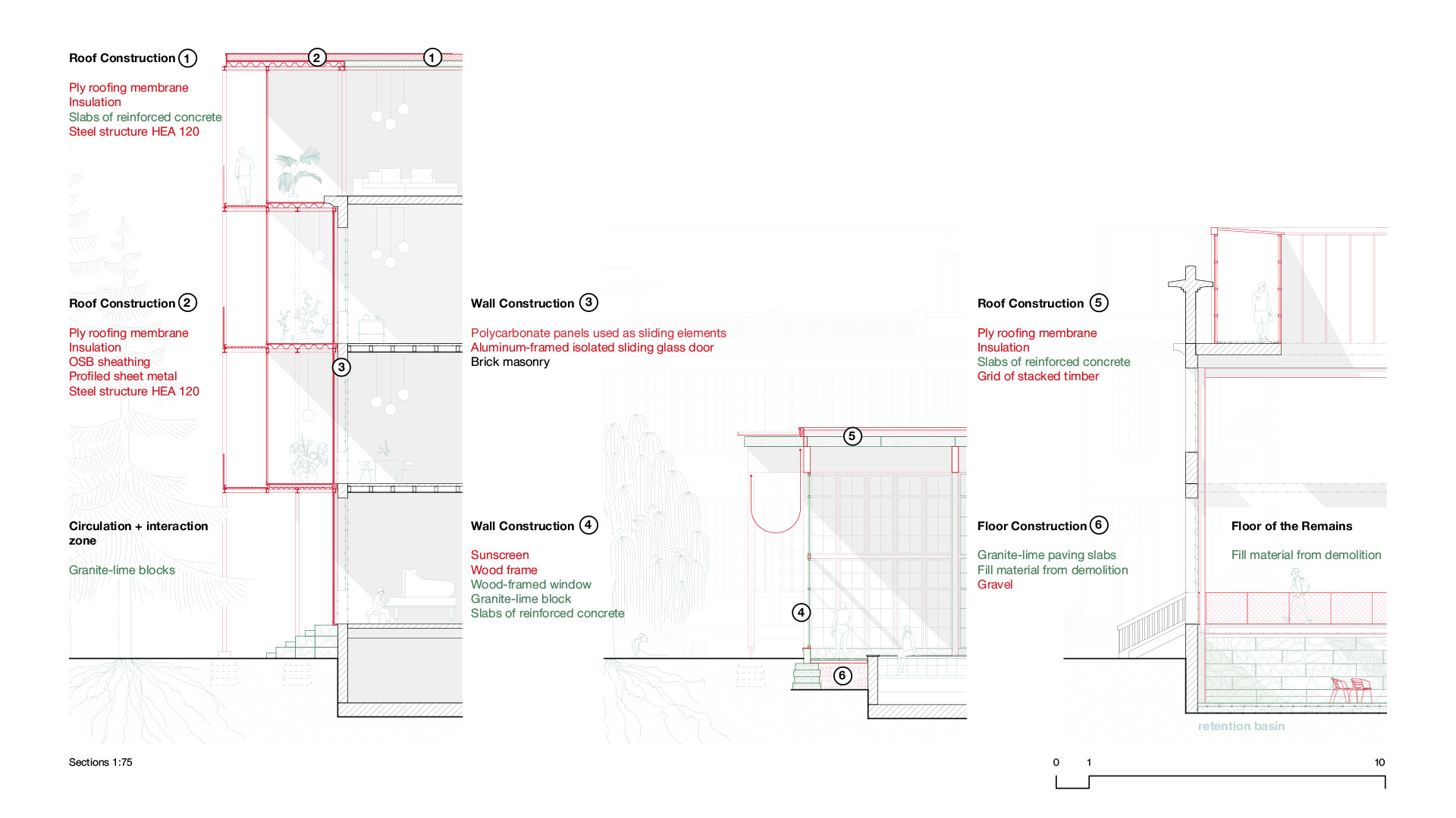 Ein zentraler Entwurfsansatz ist die konsequente Wiederverwendung bestehender Bausubstanz und Materialien: Bestandsgebäude werden behutsam umgenutzt, rückgebaut und durch reversible Konstruktionen ergänzt. Materialien aus dem Rückbau – wie Beton, Granit oder Fenster – werden vor Ort wieder eingesetzt und in neue architektonische Elemente überführt. So entsteht ein ressourcenschonender Kreislauf, der Vergangenheit sichtbar macht und gleichzeitig neue Räume für Heilung, Gemeinschaft und Öffentlichkeit schafft.